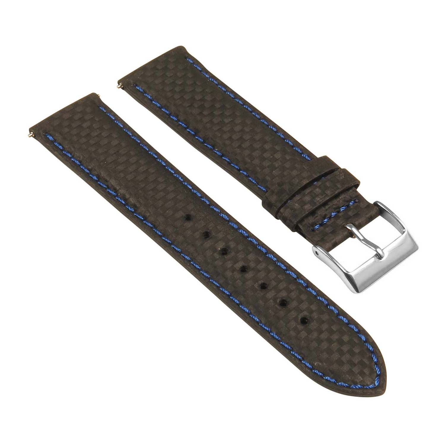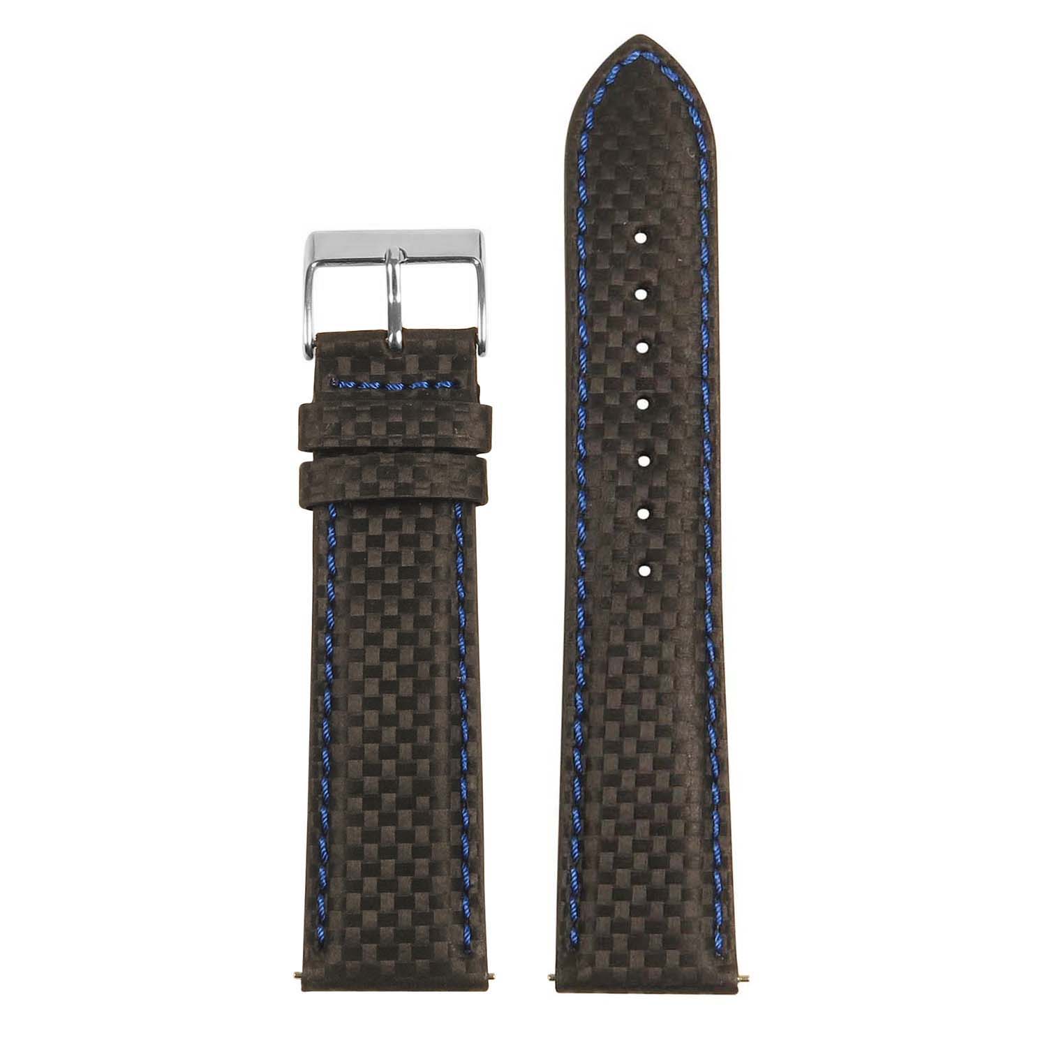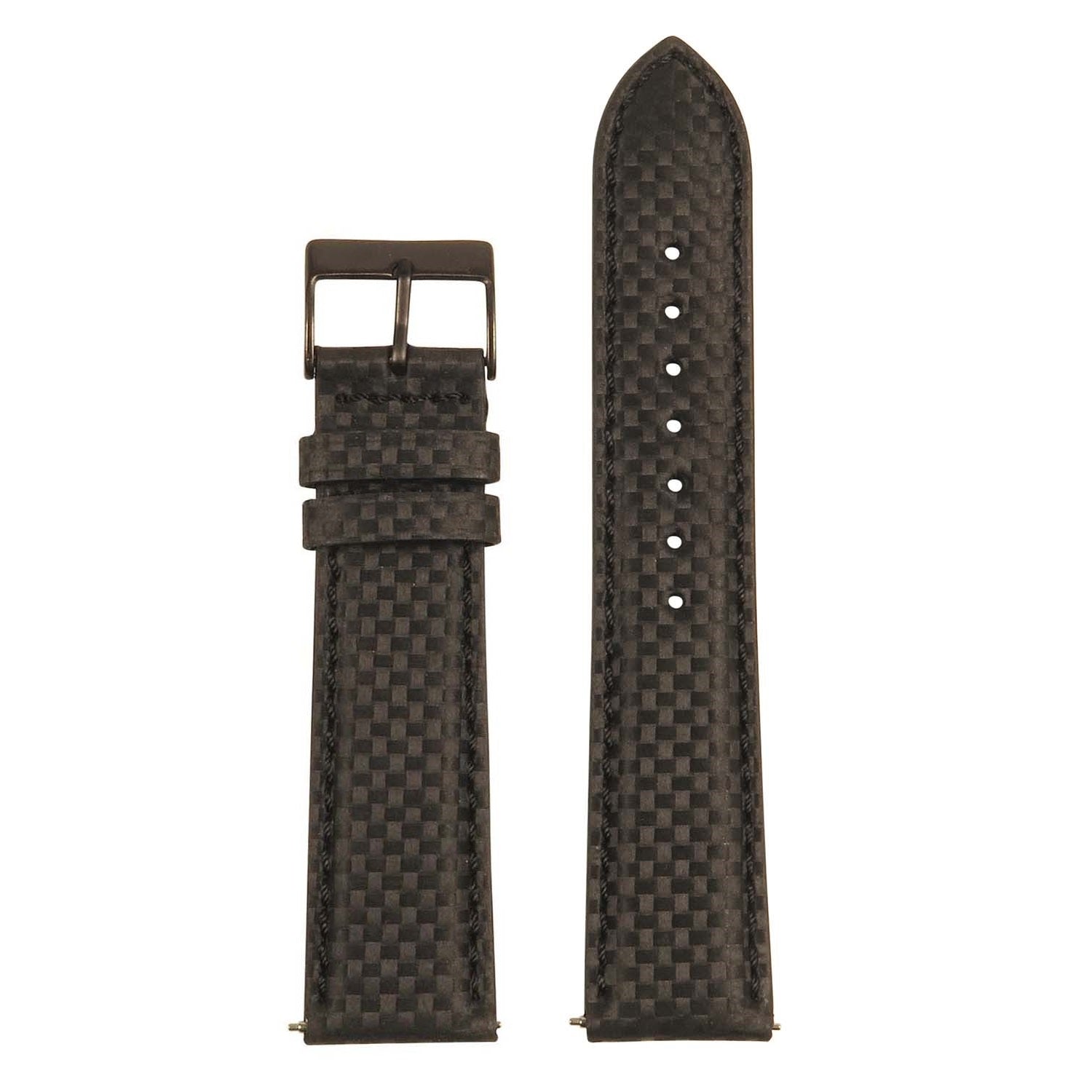 StrapsCo's padded carbon fiber watch bands for 24mm smart watches. Made from durable carbon fiber embossed leather with stitching in a variety of colors. Match your straps to your smart watch for an extra sporty and stylish look. Finished with a stainless steel tang buckle.