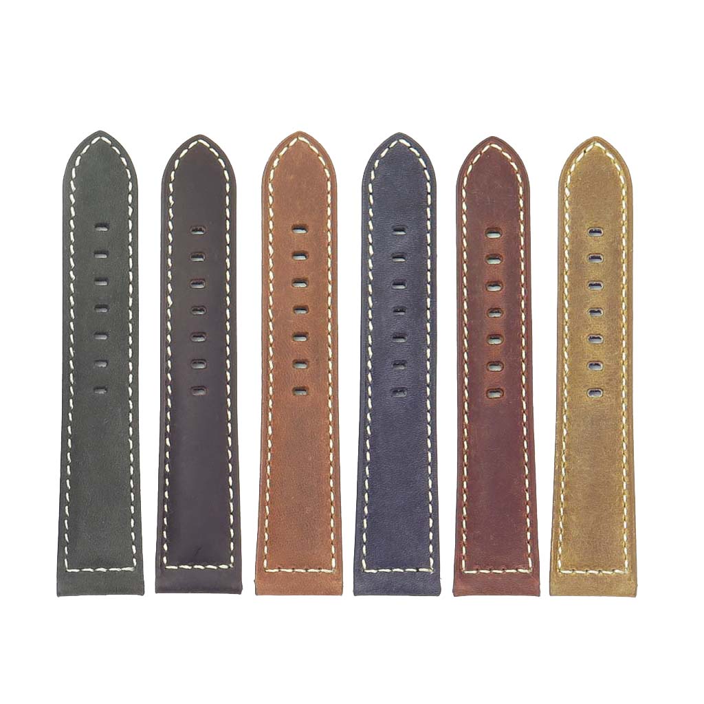 DASSARI ultra supple distressed Italian leather watch band. This thick, padded vintage watch strap features an aged leather look with a butter soft feel. Finished with a large polished Pre-V buckle.