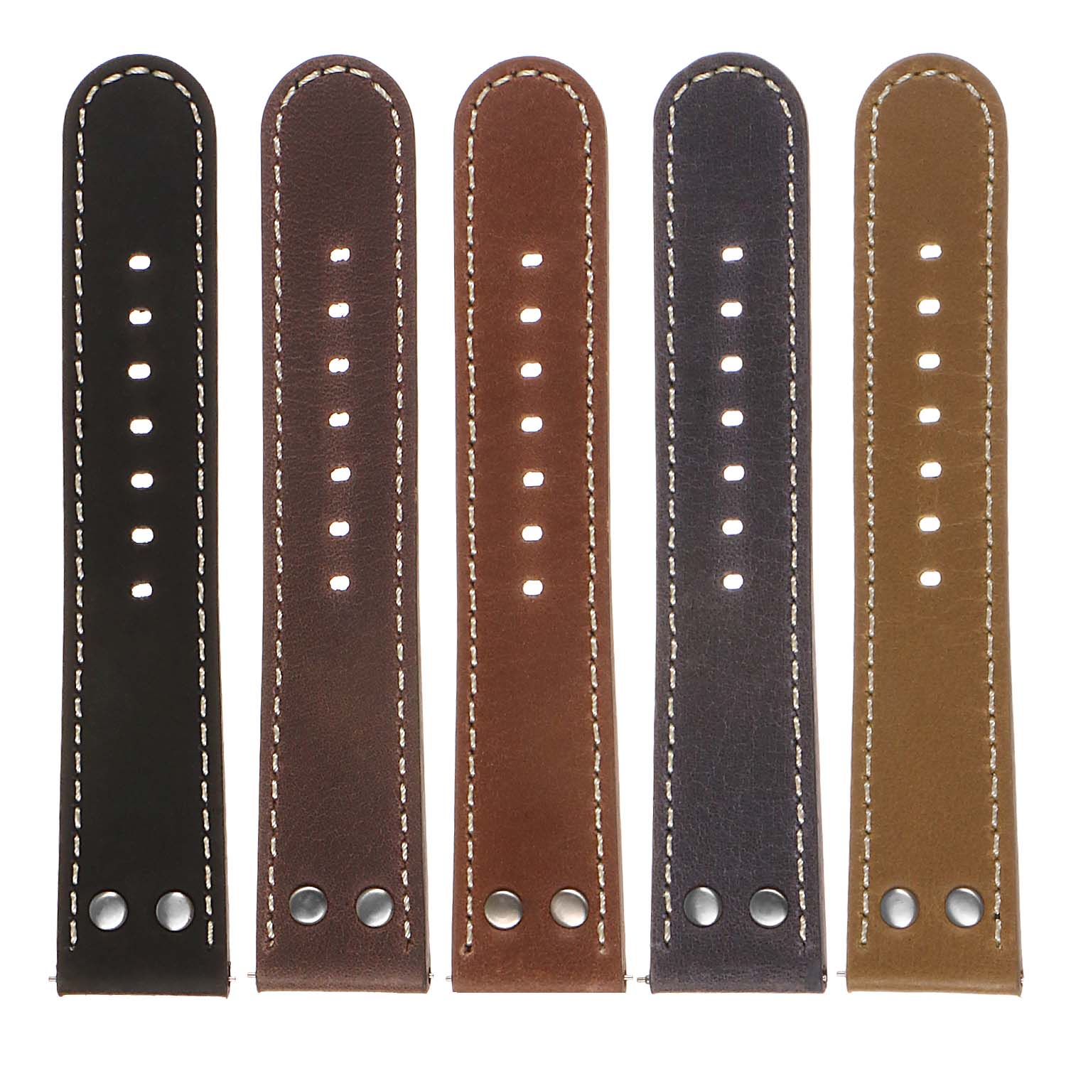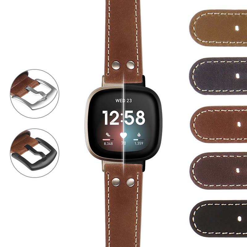Premium pilot style watch band for Fitbit Sense by DASSARI. Made from premium vintage top grain leather sourced from Italy. Features rivets with matching buckle. Comes with condensed leather backing for extra comfort and durability. Finished with ivory contour stitching.
