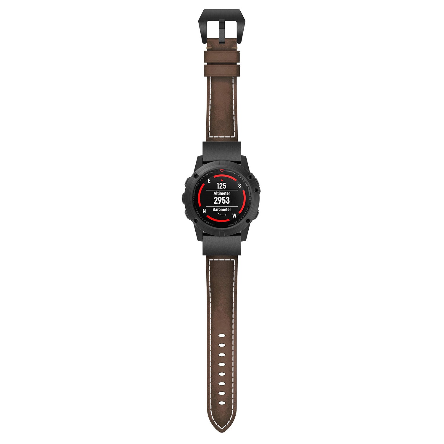 Leather replacement watch band designed for Garmin Instinct. Similar to QuickFit 22, this band snaps on and off with ease. Dress up your Garmin with this beautiful two-piece watch strap. Finished with a large, matte black Pre-V buckle.