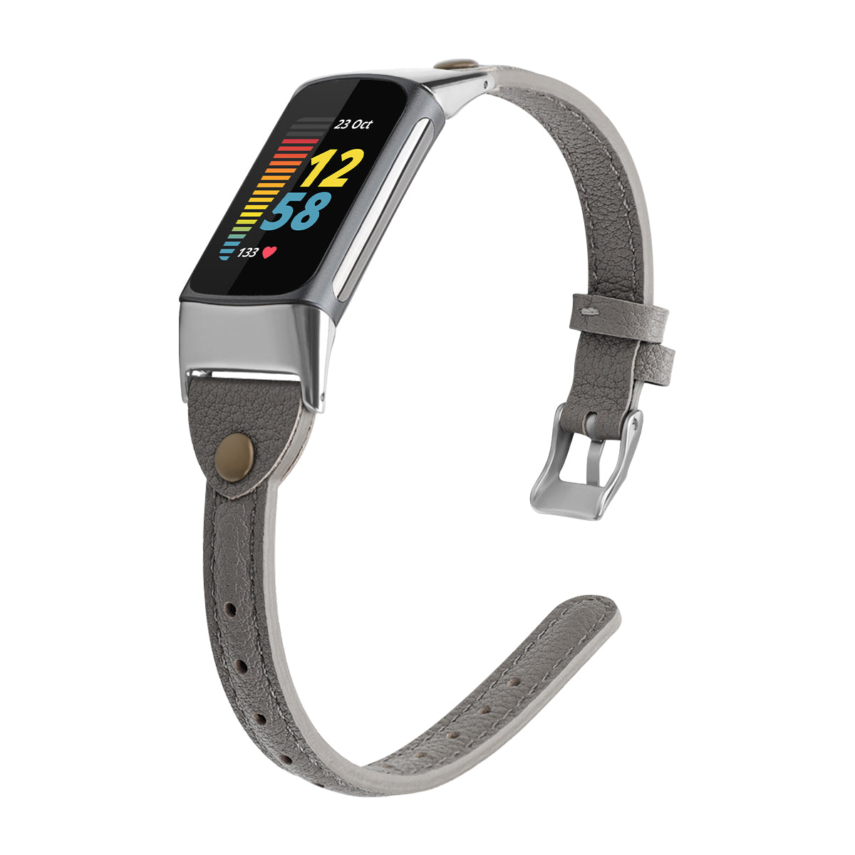 StrapsCo slim genuine leather watch band for Fitbit Charge 6. This delicate strap features brass rivets that give this strap a vintage vibe. Finished with dainty, polished silver buckles.